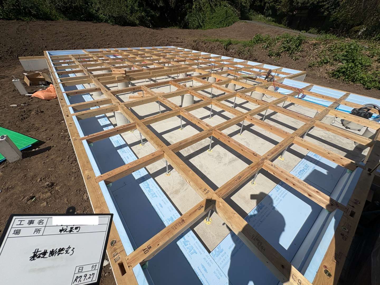 本物件では、土台敷きを行いながら基礎断熱施工を進めました。
